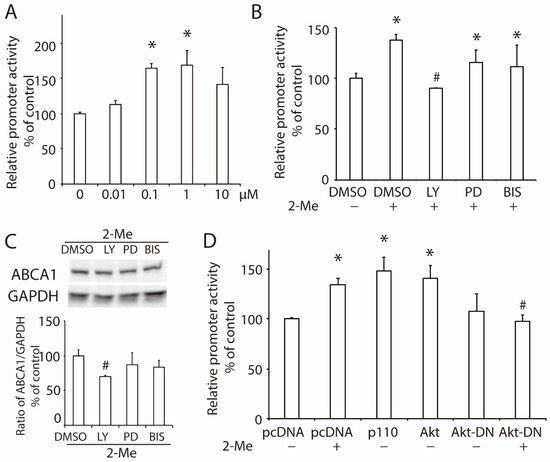 2-ME2 enhances the promoter activity of ABCA1 via the PI3K/Akt signaling pathway. (A) ABCA1 promoter activity in HepG2 cells treated with 2-ME2 at varying doses for 24 h. (B) Effects of a PI3K inhibitor LY294002 (LY), an MEK/ERK inhibitor PD98059 (PD), or a PKC inhibitor bisindolylmaleimide I (BIS) on 2-ME2-induced ABCA1 promoter activity in HepG2 cells. (C) Protein expression of ABCA1 in HepG2 cells treated with 2-ME2 with or without LY, PD, or BIS. (D) Role of the PI3K/Akt pathway on ABCA1 promoter activity induced by 2-ME2. pcDNA, control vector; p110, overexpression of the p110 catalytic subunit of PI3K; Akt, overexpression of Akt; Akt-DN, domain-negative Akt. Each data shows the mean ± SEM (n = 3) of separate experiments for each group. * p < 0.05 compared to control or pcDNA; # p < 0.05 compared to 2-ME2.