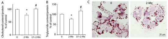 As a cholesterol exporter, ABCA1 exports intracellular cholesterol to HDL in the presence of ApoA-I. Our previous study showed that the upregulation of hepatic ABCA1 induced by insulin-like growth factor-1 (IGF-1) or glucagon-like peptide-1 (GLP-1) decreased the lipid content in HepG2 cells [19,20]. In this study, we demonstrated that 2-ME2 significantly reduced the cholesterol content to 78 ± 6% of that in the control group. However, blocking the PI3K pathway by its specific inhibitor, LY, canceled this reduction (Figure 3A). Further, the triglyceride content was significantly decreased by 2-ME2, which was blocked by LY (Figure 3B). Consistently, Oil Red O staining also showed that HepG2 cells with 2-ME2 treatment had fewer and smaller lipid droplets compared to the control group (Figure 3C). These data indicated that 2-ME2 could reduce the hepatic lipid content via the PI3K pathway.