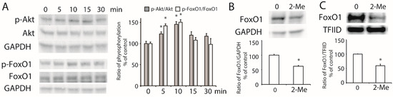 To further study the activation of Akt, HepG2 cells were treated with 1 μM of 2-ME2 for different time periods. As shown in Figure 4A, the phosphorylation of Akt was detected at 5 min and 15 min after the 2-ME2 treatment. Downstream of the PI3K/Akt pathway, FoxO1 belongs to the FoxO transcription factor family responding to the activation of Akt [21]. Next, we examined the role of FoxO1 in the effect of 2-ME2 on ABCA1 expression. The results showed that the phosphorylation of FoxO1 was stimulated by 2-ME2 from 5 min to 15 min (Figure 4A). Moreover, treatment with 2-ME2 for 24 h decreased the expression of FoxO1 in HepG2 cells (Figure 4B). Once FoxO1 was phosphorylated, it was translocated from the nucleus to the cytoplasm, which allowed stimulating ABCA1 gene transcription. As shown in Figure 4C, the nuclear abundance of FoxO1 was reduced by 2-ME2. These results demonstrated that 2-ME2 activated the phosphorylation of Akt and FoxO1, which may contribute to the regulation of ABCA1 transcription.