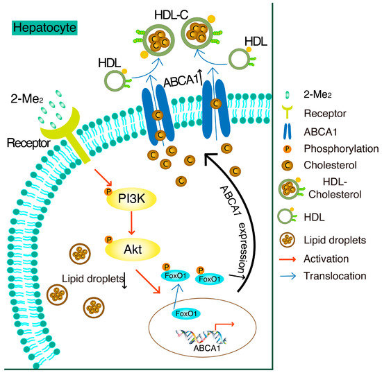 In this study, we found that 2-ME2 upregulated the expression of hepatic ABCA1 through the PI3K/Akt/FoxO1 signaling pathway (shown in Figure 6). ABCA1 is a membrane protein that plays an important role in HDL formation and in cholesterol efflux. Active transport via transporters, including the best characterized ABCA1, ABCG1, and SR-BI, is mainly responsible for the bulk efflux of cholesterol from the cells onto extracellular acceptors. Here, we reported that 2-ME2 induces the expression of ABCA1 and lowers the intracellular cholesterol content, but how the cholesterol efflux is involved in this mechanism is for further study. The dysfunction of ABCA1 in Tangier disease results in cholesterol accumulation in the peripheral tissue and causes severe HDL deficiency [5]. Typically, a specific hepatic ABCA1 knockout decreases the generation of heterogeneous-sized nascent HDL particles in vivo, leading to large TG-rich very low-density lipoprotein (VLDL) accumulation in the liver [22]. Thus, ABCA1 has a beneficial effect to protect the liver from cholesterol accumulation. This is also confirmed by our recent study that the upregulation of hepatic ABCA1 expression by insulin-like growth factor-1 (IGF-1) or glucagon-like peptide-1 (GLP-1) reduced hepatic cholesterol accumulation in mice [19,20]. In this study, hepatic ABCA1 expression was elevated by 2-ME2, which contributed to the reduction of the lipid content in hepatocytes. As reported, GPER or GPR30 is a high-affinity membrane receptor of 2-ME2 and shows its protective effect on the cardiovascular system [23]. The global knockout of GPER increased the total and low-density lipoprotein-cholesterol (LDL-C) levels in mice, while the activation of GPER by its small molecule agonist rescued this effect [24]. Moreover, the deficiency of GPER accelerates liver inflammation and fibrosis [25]. However, the specific receptor of 2-ME2 responsible for these activities remains unknown. Thus, further studying needs to be done to investigate the receptor of 2-ME2 and its role in regulating hepatic lipid metabolism.