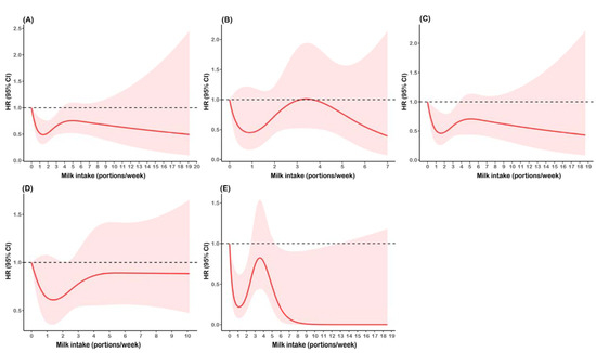 Restricted cubic spline plots to evaluate relationships between milk intake and all-cause mortality among (A) Overall participants; (B) Participants with low dietary diversity score; (C) Participants with high dietary diversity; (D) Participants with low energy intake; and (E) Participants with high energy intake. HR and 95% CI were adjusted for age, sex, education, place of residence, individual annual income, smoking status, alcohol intake, physical activity, BMI, chronic disease history, vegetable intake, fruit intake, red meat intake, dietary diversity score, and energy intake. Dietary diversity score and energy intake were not adjusted in their corresponding stratified analyses. Units of milk intake: portions/week (1 portion = 300 g).