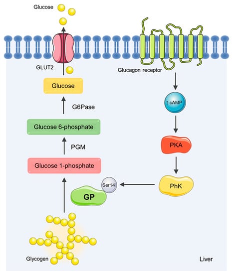Regulation of hepatic glycogenolysis. Under fasting conditions, glycogenolysis is activated and glycogen synthesis is suppressed. The activation of glucagon receptor induces the increase in intracellular cyclic AMP (cAMP) and the consequent activation of protein kinase A (PKA). PKA is responsible for the phosphorylation of phosphorylase kinase (PhK), which, in turn, activates GP by serine-14 phosphorylation. GP, as a key enzyme involved in glycogenolysis, catalyzes the removal of a glucose residue of the glycogen chain, generating glucose 1-phosphate. Glucose 1-phosphate is converted to glucose 6-phosphate by phosphoglucomutase (PGM), and glucose 6-phosphatase (G6Pase) converts glucose 6-phosphate into glucose, which can be transported to the bloodstream. This process is mediated by glucose transporter 2 (GLUT2). Image bank [].