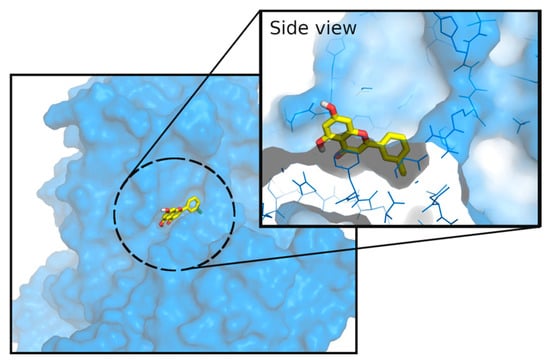 Finally, the flavonoids family was also docked into the GPa inhibitor binding site. We found that compound 46 (Figure 6), which was one of the most effective in the flavonoid family, was the only compound in this series with the simultaneous H-bonding with two residues on either side of the longitudinal plane of the pocket, in contrast to the remaining compounds (Figure S4). All other flavonoids, except for compound 48, were positioned in an inverted placement compared to that of compound 46, in a close alignment, with the B ring occupying the vertex of this V-shaped pocket. This indicated a second binding mode that was possible for the flavonoid scaffold. Overall, the binding profile for the active compounds in this series indicated that they possibly bound to the inhibitor binding site, given their close resemblance (in terms of their placement in the pocket) to different flavonoids co-crystallized with GPa.