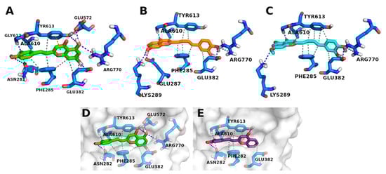 The docking results for 2-styrylchromones and 2-styrylchromone-related derivatives showed that the three active compounds, 23, 32, and 33, interacted with the two extreme ends of the pocket; namely, ASN282 or LYS289, which were paired with a simultaneous contact with GLU382 (Figure 5), in contrast to other compounds, e.g., 21 and 22, which had just one or no H-bonding groups in the B ring (Figure S3). 2-Styrylchromone 25 revealed that an H-bonding donor, specifically, was required in the A ring, as this compound had an H-bond acceptor at C-7 of the A ring. This was ideal for reaching GLU382, but it was not able to establish an H-bond with the H-acceptor carboxylate in the GLU382 side chain. A similar situation was observed with the 2-styrylchromones 26, 27, 28, and 29, in which the compounds rotated, positioning the B ring near GLU382 (possibly, the A ring became too bulky to fit in this narrower end of the pocket). As seen with 2-styrylchromone 25, these four compounds also had a H-bonding group near GLU382 (C-3′ of the B ring). However, the H-bonding with this residue was not possible, as these were all H-acceptors. The requirement for these two simultaneous points of contact was demonstrated by cases such as that of 2-styrylchromone 18, which perfectly aligned with 23. However, the former had no H-bonding groups at the end of the two fused rings (A and C), and was, therefore, not able to establish any H-bonding near LYS289.