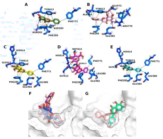 Placement of flavonoids in the GPa inhibitor binding site. (A) Contacts established by compound 38 (dark green). (B) Contacts established by compound 46 (light pink). (C) Contacts established by compound 47 (yellow). (D) Contacts established by compound 49 (magenta). (E) Contacts established by compound 51 (pale blue). (F) All flavonoids, except 46 and 48, inside the GPa inhibitor binding site, versus (G) 46 (light pink) and 48 (turquoise). Bond types are encoded as follows: hydrophobic interactions (grey), hydrogen bonds (blue), pi-stacking (orange).