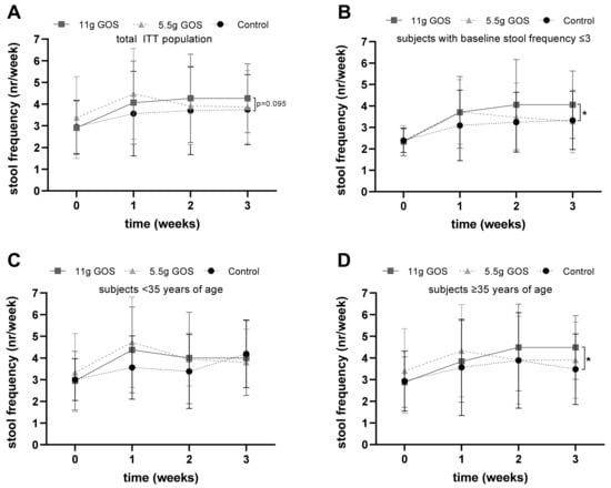 Stool frequency during the intervention period of ITT population, (A) Overview of the total ITT population for the ● control group (n = 43), ν 11 g GOS group (n = 44), and the 5.5 g GOS group (n = 45). Mixed model analysis showed a trend towards significance (p = 0.095) between the control and 11 g GOS groups at week 3. (B) Subjects from ITT population with a basal stool frequency ≤3, for the ● control group (n = 33), ν 11 g GOS group (n = 33), and the 5.5 g GOS group (n = 32). Mixed model analysis showed a significant difference * (p = 0.027) between the control and 11 g GOS groups at week 3. (C) Subjects from ITT population <35 years of age ● control group (n = 16), ν 11 g GOS group (n = 19), and the 5.5 g GOS group (n = 15). No significant differences were found in the subjects <35 years of age after mixed model analysis. (D) Subjects ≥35 years of age for the ● control group (n = 27), ν 11 g GOS group (n = 25), and the 5.5 g GOS group (n = 30). Mixed model analysis showed a significant difference * (p = 0.010) between the control and 11 g GOS groups in subjects ≥35 years of age at week 3.