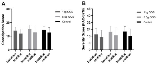 (A) Constipation score (based on Agachan et al., 1997) (ranging from 0–30) and (B) symptom severity score (PAC-SYM) (ranging from 0–48) of ITT population at baseline and after the intervention period. The ANCOVA did not show any differences in Constipation Score between 11 g GOS and control (p = 0.529), nor between 5.5 g GOS and control (p = 0.717). The ANCOVA did not show any differences in PAC-SYM scores between 11 g GOS and control (p = 0.801), nor between 5.5 g GOS and control (p = 0.446).