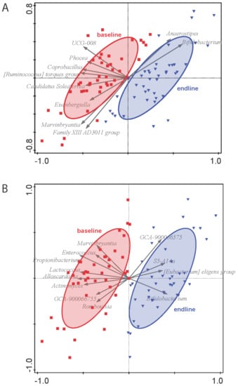Partial RDA of (A) 11 g GOS group in time and (B) 5.5 g GOS group in time. Red squares represent baseline samples, blue triangles represent endline samples. Envelopes are 2D-normal-based ellipses at the 66% level. Grey arrows represent the genera with the best fit in the ordination space on the horizontal axis.