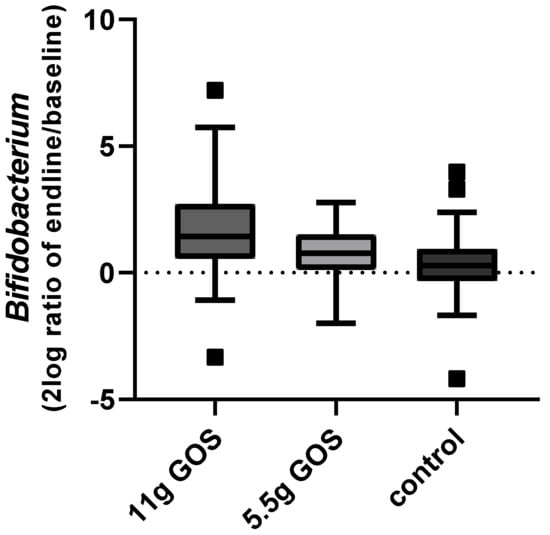 Figure 5 shows the change of Bifidobacterium during the intervention, displayed as 2log ratio of relative abundance at endline and baseline. The linear mixed model indicated that compared to baseline the relative abundance of Bifidobacterium significantly increased (p < 0.001), from 10.9% to 23.9% for the 11 g GOS group. For the 5.5 g GOS group, a non-significant change (p = 0.16) from 11.6% to 19.1% was found. Both Figure 4 and Figure 5 show a dose-response effect of GOS on Bifidobacterium levels, with a significant increase for the 11 g dose.