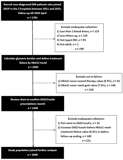 We conducted this retrospective observational cohort study at two hospitals: one is a tertiary teaching hospital center, and the other is a regional hospital, in southern Taiwan. Newly-diagnosed diabetes mellitus patients who joined the Diabetes Shared Care Program (DSCP) [28], an integrated diabetes care model designed to increase the quality of diabetes care in Taiwan, since 1 January 2011 to 31 December 2015 were recruited. Some patients were excluded if they met any of the following criteria: (1) Less than two HbA1c blood draws, (2) Loss follow-up, which was defined with too long of an interval between last two HbA1c blood draws (>365 days) or no HbA1c blood draw after run-in period, (3) not T2DM, including prediabetes, gestational diabetes, type 1 diabetes, other types of diabetes, or undetermined, (4) non-adult, with age <18, (5) have ever been prescribed OAD or insulin, (6) HbA1c value never reaches starting treatment value (HbA1c < 6.5%). Furthermore, we excluded the patient who did not complete run-in period (initial baseline HbA1c > 7.0% but further follow-up HbA1C never decreases to 7.0%) or the patient whose prescribed OAD categories or insulin injection frequencies had increased compared to the initially prescribed before the end of stable glycemic period. A total of 1048 newly-diagnosed drug-naïve T2DM patients were enrolled after the exclusion of 739 participants due to inadequate collection or failing to complete run-in period (Figure 1). The study protocol was approved by the Institutional Review Board of Kaohsiung Medical University Hospital (number: KMUHIRB-E(I)-20200204).