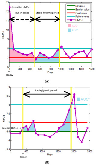 (A) An example of baseline HbA1C > 7.0%. (B) An example of baseline HbA1C ≤ 7.0%. Rx vale = starting treatment value. Goal value = treatment goal value. Failure value = treatment failure value.
