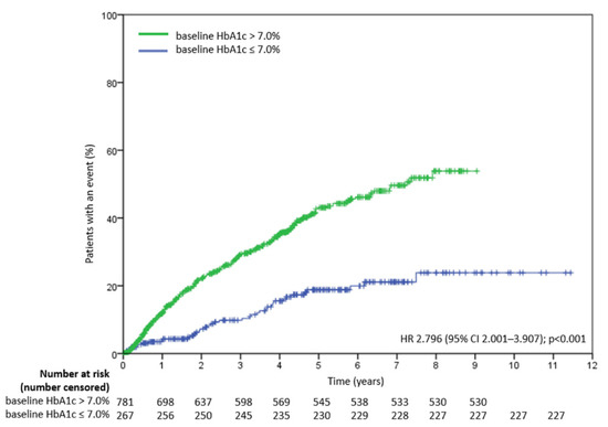 Figure 3 displays time to treatment failure in two cohorts: baseline HbA1c > 7.0% and ≤7.0%. Baseline HbA1c > 7% was associated with treatment failure (vs. HbA1c ≤ 7.0 %; HR, 2.796; 95% CI, 2.001 to 3.907; p < 0.001).