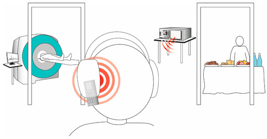The study was performed in a randomized, sham-controlled, single-blind, cross-over design. Each subject was tested on 3 experimental conditions for 25 min of exposure (mobile phone 1, mobile phone 2, and sham) spaced at least two weeks apart. On the days of experimental testing, participants reported to the Department of Neuroradiology at 6:30 a.m. after fasting for at least 12 h. To ensure that all participants were fasting at the start of the measurements, blood glucose levels were determined. No participants showed statistically significant differences in their fasting blood glucose levels (p = 0.322). One cannula was inserted into an antecubital vein for blood sampling of glucose, insulin, and C-peptide as known factors influencing glucose metabolism and appetite regulation. Thereafter, a baseline 31phosporus magnetic resonance spectroscopy (31P-MRS) sequence was recorded. Subsequently, participants were exposed to 5 min of sham/mobile phone radiation as described below. Immediately after this exposure, one 31P-MRS sequence was recorded to encompass potential direct effects of mobile phone exposure on brain energy metabolism. Thereafter, participants were exposed to additional 20 min of mobile phone or sham radiation. The duration of the exposure time was chosen regarding realistic and feasible aspects. Furthermore, studies are already available that provide guidance on appropriate stimulation times for anodal transcranial direct current stimulation in the context of high energy phosphates and food intake [30,31,32]. Subsequently, a series of 5 continuous 31P-MRS sequences was started. At 8:30 a.m., a standardized breakfast buffet [25,33] was offered from which participants were allowed to eat ad libitum during the subsequent 40 min. Participants were not informed about the actual purpose of the study to prevent them from putting a focus on food intake. Instead, they were told that the main intention of the study was to investigate the effects of mobile phone usage on cerebral energy metabolism. Thereby, participants were kept unaware of the hypothesized effects on food intake behavior and did not realize that their individual food consumption was quantified by weighing buffet components before and after the meal. To avoid overeating, participants were allowed to take with them any remaining food after final food weighing. Blood samples were obtained at baseline, at the end of the first mobile phone/sham phone exposure, at the end of the following spectroscopy recording, at the beginning and the end of the 20 min of mobile phone/sham phone exposure, at 10 min intervals during the 5 continuous spectroscopy sequences, and before and after the buffet test. Schematic illustration of the laboratory setting (Figure 1).