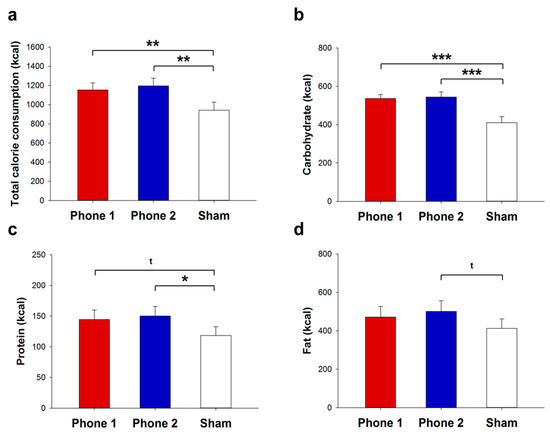 Calorie consumption after mobile phone exposure. Total calorie consumption (a), as well as ingested calorie content in the form of carbohydrates (b), proteins (c), and fat (d) from a standardized free-choice ad libitum buffet after 25 min of mobile phone (phone 1 (red bars) and phone 2 (blue bars) or sham (white bars)) exposure, respectively. Values are mean ± s.e.m.; two-tailed Student’s t-test; n = 15; * p < 0.05, ** p < 0.01, *** p < 0.001, t p < 0.1.