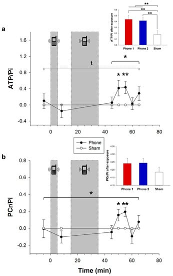 Results of ATP/Pi and PCr/Pi ratios show comparable values for all experimental conditions at baseline (all p > 0.429), and after 5 min of mobile phone exposure (all p > 0.160). After the extended radiation procedure for a further 20 min, ATP/Pi levels were higher as a trend than after sham (p = 0.074, Figure 3a), an effect that was significant in terms of PCr/Pi ratios (p = 0.038, Figure 3b). Apparently, this was mainly due to differences at 50 and 55 min after radiation onset (p < 0.036 and p < 0.006, respectively, Figure 3a,b). Comparison of mean post-exposure ATP/Pi values revealed significantly higher levels after RF-EMFs radiation compared with sham (p = 0.009, Figure 3a, small insert). Differential analyses showed increased ATP/Pi levels by 3% after both phone 1 (p = 0.003) and phone 2 (p = 0.006) application than after sham, respectively (Figure 3a, small insert). These effects did not reach significance in terms of PCr/Pi ratios (p > 0.147, Figure 3b, small insert).