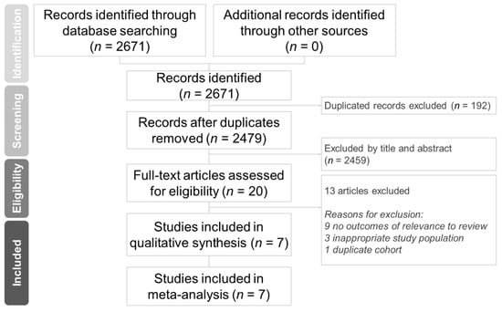 Through database searching, we identified 2671 citations. Twenty full-text articles were assessed for eligibility, 13 of which were rationally excluded. The remaining seven studies met the methodological quality criteria and were included in the meta-analysis [10,23,24,25,26,27,28]. The study selection process is illustrated in Figure 1.