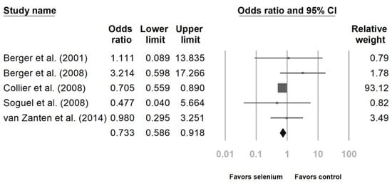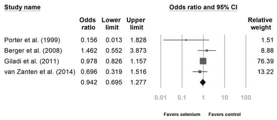 Six studies reported the impact of Se supplementation on the mortality rate of patients sustaining major trauma [10,23,24,25,27,28]. The pooled results showed that Se supplementation was associated with a lower mortality rate (Figure 2, OR 0.733, 95% CI: 0.586, 0.918, p = 0.007; heterogeneity, I2 = 0%). Regarding the incidence of infectious complications, there was no statistically significant benefit after analyzing the four studies (Figure 3, OR 0.942, 95% CI: 0.695, 1.277, p = 0.702; heterogeneity, I2 = 14.343%) [23,24,26,27].