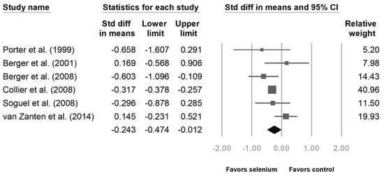 Deceased mortality was observed in patients administered Se supplementation (OR 0.733, 95% CI: 0.586, 0.918, p = 0.007). As the trimodal of mortality has shown [1], the mortality of trauma patients is initially related to injury severity. The protective effect of Se might reduce the inflammatory responses after severe trauma and, accordingly, reduce the mortality in the recovery phase. There were only limited numbers of studies with relatively small sample sizes, so the effect on mortality should be interpreted with caution. Moreover, the large cohort could influence the result for the study group. The hypermetabolic response, trace element losses following hemorrhage, and fluid resuscitation are unique to trauma. Some studies have reported that supplementary Se did not improve survival in critically ill patients [29,30]. In these studies, Se supplementation was provided to random critically ill patients without considering the patients’ conditions. In contrast, some authors reported that Se administration could be beneficial for patients with Se deficiency whether in severe burn or multiple trauma [15,31].