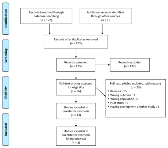 The literature review recognized a total of 172 records and one additional article was identified manually as shown in Figure 1. Of those, 137 were excluded after screening. Then, 23 studies were excluded after review because of wrong type of literature (n = 16), outcome (n = 1) or population (n = 5). One study was excluded because of the overlap with another study published by the same researchers at the same time [17]. Finally, 13 studies were included in the qualitative synthesis (including 10 RCTs and 3 meta-analyses) and 3 in our meta-analysis. No relevant unpublished studies were obtained from abstract meetings.