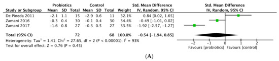 We found only one study out of seven with results in favor of probiotics supplementation (MD (95% CI) −0.351, (−0,58 to −0,13), p = 0.003) (Table 3) [18]. Two meta-analysis available did not shown any significant difference between probiotic and placebo groups (respectively, SMD (95% CI) 0.171, (−0.391 to 0.733), p = 0.551, I2 = 54%; SMD (95% CI) −0.30 (0.62 to 0.02), I2 = 0%) by pooling 191 and 153 patients (Table 4) [29,30].