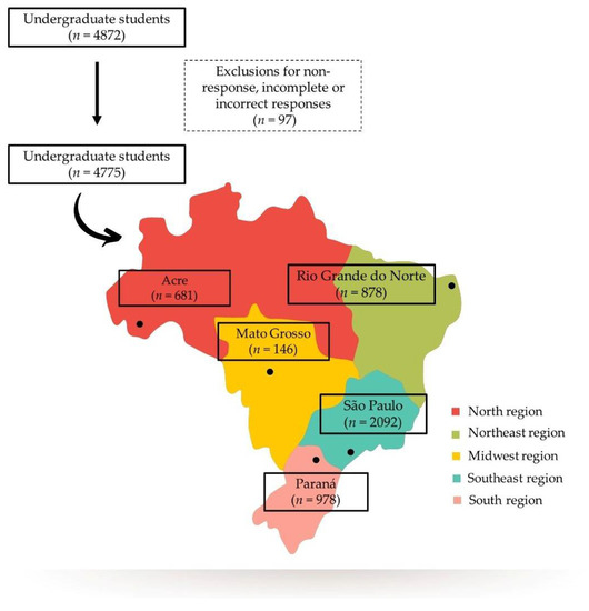 This is a cross-sectional study, with data collection conducted from August 2020 to February 2021, corresponding to the middle of first the COVID-19 wave and beginning of the second wave in Brazil [8]. The study population consisted of undergraduate students from the following universities, located in one of the 5 different Brazilian regions: the Federal University of Acre (north region), Federal University of Rio Grande do Norte (northeast region), University of São Paulo (southeast region), Federal University of Mato Grosso (midwest region), and Federal University of Paraná (south region). Students regularly enrolled in an undergraduate course were eligible for the study. Those who consented to participate in the study and answered the online questionnaire were included (n = 4872). A total of 97 students were excluded from the study due to non-response or incomplete responses concerning the food insecurity scale used in the study, totaling 4775 participants (Figure 1).