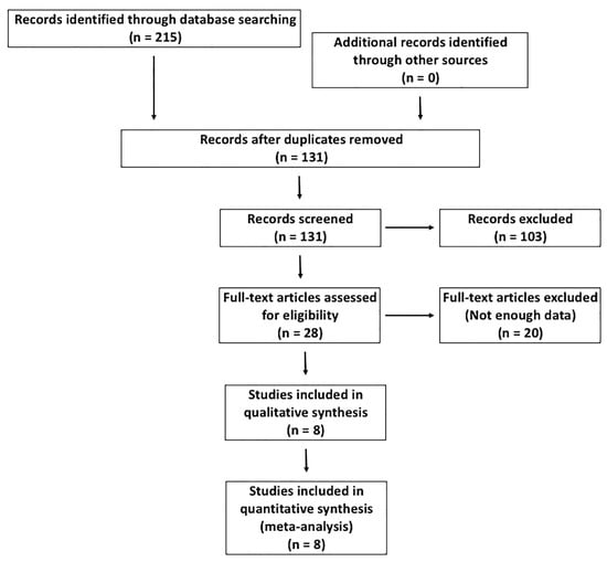 Figure 1 shows the flow chart of the studies selected for inclusion in the meta-analysis. We initially identified 215 candidate articles for inclusion. After removing duplicates, the abstracts of 131 articles were reviewed and 103 were excluded. Thus, a total of 28 full text studies were assessed for eligibility. Of these, 20 articles were excluded because they did not contain the necessary information to carry out the meta-analysis (Supplementary Material Table S2). Therefore, eight studies that fulfilled the inclusion criteria were finally included in the meta-analysis [,,,,,,,]. The response to vitamin D supplementation according to the BsmI polymorphism in the VDR gene was analysed in six studies [,,,,,]. Five studies analysed the vitamin D response according to the genotypic distribution of the TaqI genetic variant [,,,,]. The influence of the ApaI polymorphism was studied in four articles [,,,]. Finally, the influence of the FokI polymorphism in the response to vitamin D supplementation was analysed in five studies [,,,,].