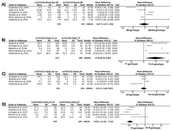 The results of the meta-analysis are shown in Figure 2. The results showed that the BsmI genetic variant was not significantly associated with the response to vitamin D supplementation (p = 0.81, Figure 2A). In the case of the TaqI polymorphism, the variant allele (Tt+tt genotype) was significantly associated with a better response to vitamin D supplementation (p = 0.02, Figure 2B). There was no significant association between the ApaI variant and the response to vitamin D supplementation (p = 0.63, Figure 2C). Finally, subjects carrying the FF genotype of the FokI polymorphism in the VDR gene responded better to vitamin D supplementation than subjects with the variant allele (Ff+ff) (p < 0.001, Figure 2D).