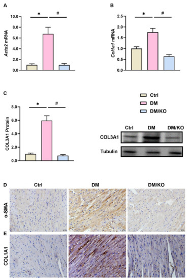KO prevented the DM-induced cardiac expression of profibrotic genes. Cardiac mRNA expression of (A) Actα2 and (B) Col1α1 were determined by qRT-PCR. Cardiac protein expression of (C) COL3A1 was determined by Western blot and (D) α-SMA and (E) COL1A1 were detected by Immunohistochemical staining (Bar = 20 μm). Tubulin and Rplp0 (also known as 36b4) were used as endogenous controls for Western blot and qRT-PCR, respectively. The data were normalized to Ctrl and summarized as means ± SD. *, p < 0.05 vs. Ctrl; #, p < 0.05 vs. DM. Abbreviations: α-SMA, alpha-smooth muscle actin; Actα2, actin alpha 2; Col1α1, collagen 1 alpha 1; COL3A1, collagen 3 alpha 1; Rplp0, acidic ribosomal phosphoprotein P0. Other abbreviations are the same as Figure 1.