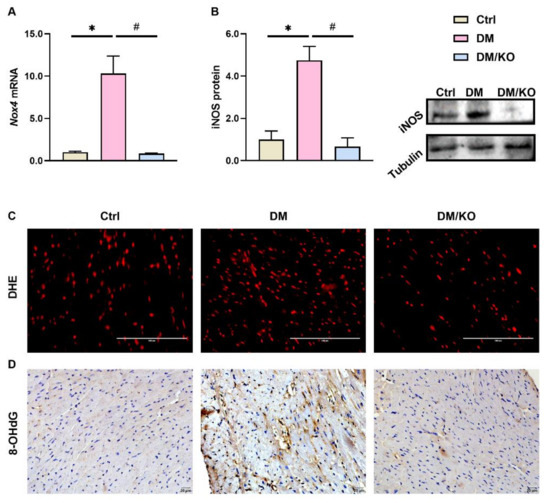 KO attenuated the DM-generated cardiac oxidative stress. (A) Nox4 mRNA levels. (B) iNOS protein levels. Tubulin and Rplp0 were used as endogenous controls for Western blot and qRT-PCR, respectively. (C) Representative microphotographs of DHE staining in heart sections in each group (Bar = 100 μm). (D) Immunohistochemical staining showed expression of 8-OHdG (Bar = 20 μm). The data were normalized to Ctrl and summarized as means ± SD. *, p < 0.05 vs. Ctrl; #, p < 0.05 vs. DM. Abbreviations: DHE, dihydroethidium; Nox4, NADPH oxidase 4; iNOS, inducible nitric oxide synthase; 8-OHdG, 8-hydroxy-2 deoxyguanosine. Other abbreviations are the same as Figure 1 and Figure 2.