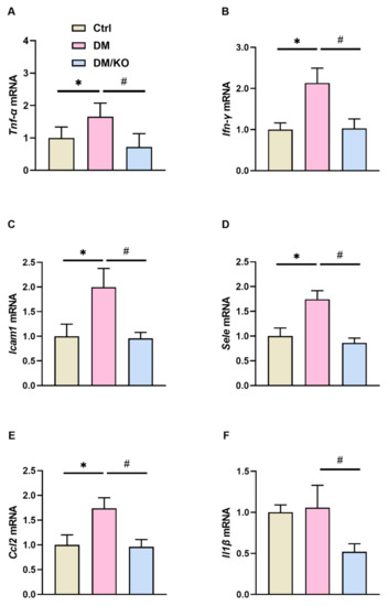 KO ameliorated the DM-promoted proinflammatory gene transcription. Cardiac mRNA expression of (A) Tnf-α, (B) Ifn-γ, (C) Icam1, (D) Sele, (E) Ccl2, and (F) Il-1β were determined by qRT-PCR. Rplp0 was used as an endogenous control. The data were normalized to Ctrl and summarized as means ± SD. *, p < 0.05 vs. Ctrl; #, p < 0.05 vs. DM. Abbreviations: Ccl2, C–C motif chemokine ligand 2; Icam1, intercellular adhesion molecule 1; Ifn-γ, interferon gamma; Il-1β, interleukin 1beta; Sele, selectin; Tnf-α, tumor necrosis factor alpha. Other abbreviations are the same as Figure 1 and Figure 2.