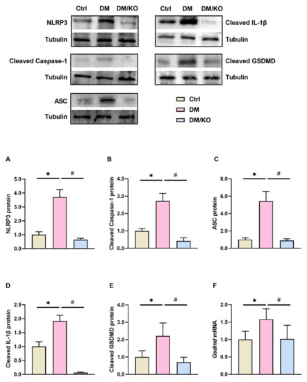 KO drastically inhibited NLRP3 inflammasome activation in the diabetic hearts. Cardiac protein expression of (A) NLRP3, (B) Cleaved caspase-1, (C) ASC, (D) Cleaved IL-1β, (E) Cleaved GSDMD were determined by Western Blot. (F) Gsdmd mRNA levels. Tubulin and Rplp0 were used as endogenous controls for Western blot and qRT-PCR, respectively. The data were normalized to Ctrl and summarized as means ± SD. *, p < 0.05 vs. Ctrl; #, p < 0.05 vs. DM. Abbreviations: ASC, adaptor apoptosis-associated speck-like protein containing a caspase activation and recruitment domain; GSDMD, gasdermin D; NLRP3, Nod-like receptor family, pyrin domain containing 3. Other abbreviations are the same as Figure 1 and Figure 2.