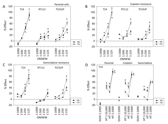 Influence of 48 and 72 h OMWW incubation on the growth of parental (A), cisplatin- (B) and gemcitabine-resistant (C) T24, RT112, and TCCSUP bladder cancer cell lines. Efficacy is expressed as a percentage compared to controls (without OMWW) set to zero. (D) Efficacy of different hydroxytyrosol (HT) concentrations or ethanol in diminishing the number of T24 tumor cells (parental, cisplatin-, and gemcitabine-resistant), compared to the control (EtOH 1:1000) set to zero. Error bars indicate standard deviation (SD), n = 5. * indicates significant difference to the corresponding control.