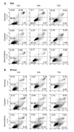 Apoptosis was evaluated in T24 (Figure 3A) and RT112 (Figure 3B) cells 24 and 72 h following exposure to OMWW, diluted 1:250. Necrosis was not induced. However, OMWW caused a slight elevation of apoptotic cisplatin-resistant T24 cells after 72 h (late apoptosis) and enhanced the percentage of gemcitabine-resistant T24 cells in early apoptosis after 72 h. A moderate increase of gemcitabine-resistant RT112 cells undergoing early apoptosis was also apparent 24 h after OMWW addition.