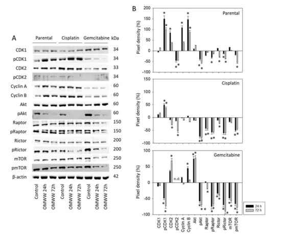 Subsequent studies concentrated on cell cycle-regulating protein expression in parental, cisplatin-, and gemcitabine-resistant RT112 and T24 cells. OMWW induced a time-dependent increase of pCDK1, CDK2, Cyclin A and B in parental RT112 cells with maximum effects after 24 h (Figure 6A-Western blot and Figure 6B-pixel density, Supplementary Figure S1). In contrast, pCDK2 was time independently considerably diminished. Suppression of pAkt (24 h, 72 h), pRaptor (24 h), Rictor (24 h, 72 h), pRictor, and pmTOR (both 72 h) were also observed. In cisplatin-resistant RT112 cells, pCDK1 was up-regulated equally well by OMWW after 24 and 72 h, whereas both CDK2 and pCDK2 were only down-regulated after 72 h. Cyclin A and B were not altered by OMWW. Phosphorylated proteins of the Akt-mTOR axis were reduced to the same extent after 24 and 72 h. Diminished activity of the Akt-mTOR axis was also seen when gemcitabine-resistant RT112 cells were treated with OMWW (24 h, 72 h). However, contrary to the decrease of pAkt, the total Akt protein was elevated under OMWW after both 24 and 72 h. Phosphorylated pCDK1 was suppressed after 24 h and nearly lost after 72 h incubation with OMWW. Phosphorylation of CDK2 was not clearly detectable in the gemcitabine-resistant cells.