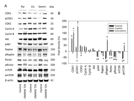 T24 cells were also evaluated following 72 h OMWW-treatment. CDK1 was enhanced in the parental and gemcitabine-resistant cells, whereas pCDK1 and CDK2 were reduced in the cisplatin-resistant subline (Figure 7A-Western blot and Figure 7B-pixel density, Supplement S1). pAkt, pRaptor, and pmTOR were all suppressed in parental and cisplatin-resistant cells. However, pRaptor and pmTOR increased in the gemcitabine-resistant subline. pRictor was found to be down-regulated in all T24 cell sublines.