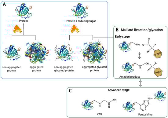 Maillard reaction products are components formed upon heat treatment applied during food processing [20]. High heat and a prolonged cooking time of food that contains sugars increase the amount of AGEs in the food, and are accompanied by the structural changes in the food proteins [21,22]. Therefore, MR and the heat-induced structural changes in proteins take place in parallel, which makes it difficult to provide a clear distinction between the effect of heating and an effect of MR on the protein structure, e.g., when considering the aggregation [21]. For MRP formation, the initial step of heating is for the protein to start denaturing and unfolding, which is partly reversible; next comes irreversible aggregation when temperatures further increase. The extent to which each individual protein will unfold and aggregate depends on the temperature plus the time of heating, pH, protein concentration, presence of other proteins and the stability of the native structure of the proteins [23]. This protein unfolding can also lead to the exposure of structural elements located in the interior, such as the β-sheet structures, and thus can change the hydrophobicity [7]. Moreover, neo β-sheet structures can be formed upon heating via amyloid fibril formation. In parallel to these processes, the MR can promote protein aggregation and affect the types of aggregates that are formed (as shown in Figure 1A). Therefore, the effect of the heat treatment on the protein structure is a combination of an effect of the temperature itself and the interaction of amino acids with sugars due to the MR, as illustrated on Figure 1.