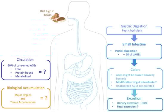 With the growing awareness of endogenous AGEs and their potential harmful effects in the human body, it became important to determine whether dAGEs contribute to the human AGE pool, and thus studies began to describe the metabolic pathway of dAGEs. To date, the available information regarding the absorption, distribution, metabolism and excretion of dAGEs is not entirely clear (as shown in Figure 2) [20], and it seems to be highly dependent on the AGEs’ structure and form (protein-bound vs. free) [17]. Nonetheless, animal and human studies concur that dAGEs are partially absorbed in the intestine and distributed across various tissues and organs [2,10,22]. It has been estimated that the absorption of AGEs into the circulation is approximately 10%, and up to 30% can be detected in the urine [2,20,22,39,40]. AGEs’ molecular weight (MW) has an impact on the absorption rate, with low MW AGEs being relatively quickly absorbed, bio-transformed and excreted, whilst high MW AGEs are normally absorbed more slowly, probably due to insufficient degradation by gastrointestinal enzymes [33]. Approximately 60% of the absorbed AGEs remain within the body for 72 h on average [1,2]. In animal studies after 3 days, more than half of the absorbed AGEs were located in the kidney and liver, but they were also found in the heart, lung and spleen [2,20]. In the colon, there is increasing evidence that dAGEs may be able to modify local microbiota metabolism and hence modulate gut integrity; this local colonic action playing an important component of the pro-inflammatory role of the dAGEs in the body [33]. Snelson et al. published a comprehensive review regarding the in vitro effects of dAGEs on gut microbiota composition and concluded that although glycated substrates do alter microbial composition in vitro, there is no consensus yet on which compositional changes occur. In addition, in vivo findings on whether dAGEs have a negative or positive influence on the intestinal microbiota are conflicting [33].