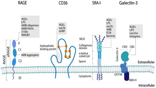 To date, several AGE receptors have been identified, including RAGE, oligosaccharyl transferase complex protein 48 (AGER1), 80 K-H protein (AGER2) and galectin-3 (AGER3) [20,56,57,58]. Additionally, several AGE receptors have been identified that belong to the heterogenous scavenger receptor family, which include class A type I and II (SR-AI/II), class B type I (SR-BI), CD36 and lastly Toll-like receptors [59,60,61,62].