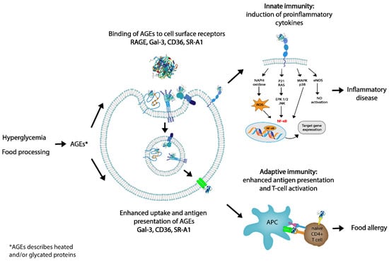 Regarding the immunogenicity of AGEs through receptor recognition, it is crucial to note that some receptors, such as RAGE, only bind the AGEs and produce cytokine as a result, but other receptors, such as galectin-3, also internalize the proteins, leading to enhanced antigen presentation of the protein to which the AGEs are bound, which may lead to the activation of food protein-specific T cells [72,83,86,87]. Therefore, the initiation of adaptative immunity by AGEs will occur indirectly via antigen presentation, ultimately leading to T-cell activation.
