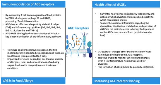 Food proteins through interaction with pathogen recognition receptors (PRR), which includes macrophage scavenger receptors and RAGE, may modulate additional downstream immunological effects promoting T cell activation and differentiation, leading to Th2 responses in food allergies [45,83]. Further potential immunological modulatory effects of AGEs include the ability to create novel epitopes that are recognized by IgE, the capacity to enhance inflammatory conditions as well as oxidative stress, and causing a reduction in the diversity of the intestinal flora which is associated with an enhanced susceptibility to allergies [17,46,53,64,66,72,81,82,83,84,85].
