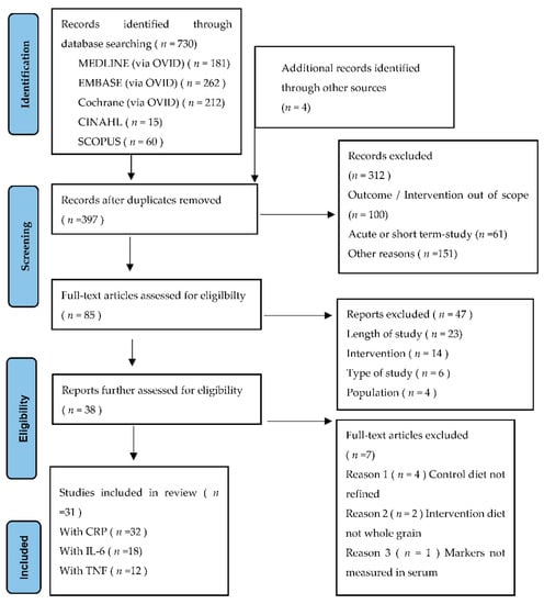 The initial search, conducted on 31 August 2021, returned a total of 730 studies. An additional four studies were identified from the reference list of eligible studies and manual searches from PubMed. After the removal of duplicates, 397 were screened for the title and abstract, with a further 312 studies excluded. A full-text review was completed on the remaining 85 records, with 47 removed due to the type of study, study did not have an adult population, or length of the RCT < 4 weeks. The remaining 38 studies were further assessed, with six removed as the control or intervention diet was not whole or refined grains and one measured inflammation in fecal matter, not from blood serum. A remaining total of 31 RCTs met the inclusion criteria and were included in the systematic review (Figure 1).