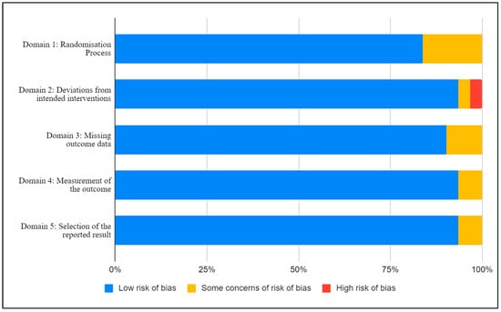 A summary of the within-study risk of bias is shown in Figure 2. The included studies were assessed against the predetermined criteria of the Cochrane RoB2 tool for randomized control and crossover trials []. Within Domain 1: Randomization Process, there were five studies with some concerns of bias [,,,,], with the remaining studies (n = 26) with a low risk of bias. In Domain 2: Deviations from intended intervention, there was one study with a high risk of bias [], one with some concern [], and the remainder with a low risk of bias (n = 29). Three studies had some risk of bias for Domain 3: Missing outcome data, [,,], and the remainder had a low risk of bias (n = 28). Two studies had some risk of bias for both Domain 4: Measurement of the outcome [,] and Domain 5: Selection of the reported result [,], with the remainder having a low risk of bias (n = 29).
