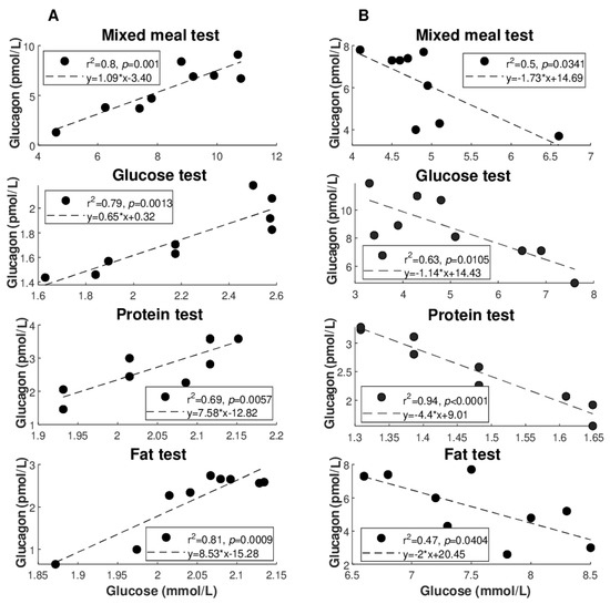 Best regression (highest R2 value) between glucagon and glucose for each of metabolic tests in individual regression analysis ((A) direct regressions; (B) inverse regressions). Values are log-transformed in following cases: glucose, protein, and fat tests in (A); protein test in (B).