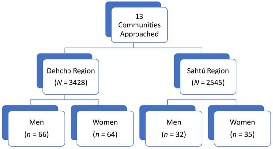 Thirteen communities were approached to participate in the project. Nine accepted, with six communities in the Dehcho and three in the Sahtú regions (see Figure 1). Community members aged six years and older were eligible to participate, regardless of sex, family status, or ethnicity. Exclusion criteria for the study included community members younger than six years old, individuals who were unable to provide free and informed consent, minors who were unable to obtain the consent of their parent or guardian, and those unwilling to receive their personal results []. The project ran from January 2016 to March 2018, and data were collected in January 2016, November 2016, January and November 2017, and March 2018. To ensure community representation, recruitment for participants in the larger study was conducted through posters, word of mouth, and local radio interviews. In addition, sampling proportional to community size was conducted, with a minimum target of 10% of the population per community, and aimed to represent the sex and age distribution of the community population. In larger communities of more than 100 residents, randomly selected households were called by phone to invite all residents in the household to participate []. The number of households contacted in each larger community was based on the number of individuals in each household, the total number of landlines within the community, and the community’s size. To sample at least 10% of the residents in the community, calculations assumed that 25% of contacted households would participate. Subsequently, 40% of households were randomly selected []. More detailed sampling strategies and procedures can be found in previously published work about the Mackenzie Valley Study [].