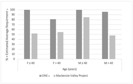 Likewise, the present study warrants further investigation into the direct health effects of low Vitamin A and D intake and its association by gender, as the majority of the CINE and Mackenzie Valley groups did not meet the EAR or AI of Vitamin A and D, including men’s intake of Vitamin D, which appeared to decrease.