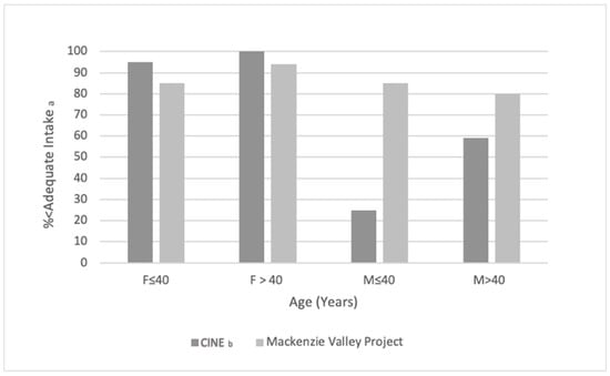 Temporal comparison between 1994 (CINE Study) and 2016–2018 (Mackenzie Valley Project) for Vitamin D intake less than the adequate intake (AI) in Dene/Métis adults from the NWT. a For Vitamin D, the AI was assumed at 5 mg/day for F and M ≤ 40 and 10 mg/day for F and M > 40. b From “Vitamins A, D, and E in Canadian Arctic traditional food and adult diets’’ []. F = female; M = male.