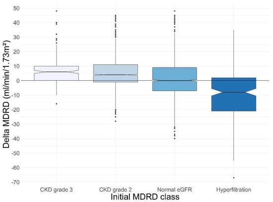 Patients significantly increased their eGFR (85 (74; 97) mL/min/1.73 m2 vs. 88 (77; 101) mL/min/1.73 m2, p-value < 0.01), resulting in an overall increase of 3 mL/min/1.73 m2 (−3; 10). Similar results were found for patients with a normal initial eGFR (98 (93; 106) mL/min/1.73 m2 vs. 100 (94; 108) mL/min/1.73 m2, p-value < 0.01), as well as patients with CKD grade 2 (78 (71; 83) vs. 79 (72; 85) mL/min/1.73 m2, p-value < 0.01) and patients with CKD grade 3 (54 (49; 57.5) vs. 59 (52; 65) mL/min/1.73 m2, p-value < 0.01), who experienced an increase in MDRD values (Table 3 and Figure 1). Inversely, patients with hyperfiltration prior to RNPC© program experienced a decrease in their eGFR (130 (124; 138) vs. 123 (109; 137) mL/min/1.73 m2, p-value < 0.01) (Table 3).