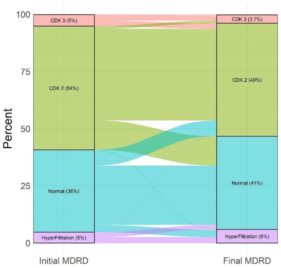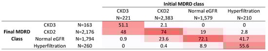 Overall, there were significant changes in the proportion of MDRD classes over time. From the 221 patients initially in CKD grade 3, 106 (48%) moved to CKD grade 2 and 2 (1%) to normal eGFR. From the 2383 patients in CKD grade 2, 562 (23.6%) move to normal eGFR. Conversely, 50 (2.1%) and 8 (0.4) moved to CKD grade 3 or hyperfiltration, respectively. From patients with normal eGFR, 301 (19%) moved to CKD grade 2 and 138 (8.7%) to hyperfiltration. Finally, from 210 patients with hyperfiltration, 90 (42.9%) moved to normal eGFR and 6 (2.8%) to CKD grade 2 (Figure 2 and Figure 3). Figure 2 shows that, for each initial MDRD class, most of the patients remained in the same MDRD class.
