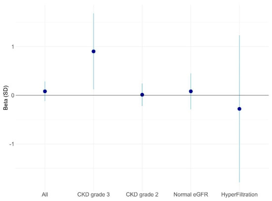 Using multivariable linear regression, the main factors associated with a decrease in MDRD at the final measure were the initial MDRD value (beta = −0.19 (standard deviation (SD): 0.01), p < 0.01), sex (women) (beta = −1.03 (± 0.46), p = 0.03), and history of diabetes (beta = −1.69 (±0.56), p < 0.01). The initial BMI value was associated with an increase in the MDRD value (beta = 0.08 (±0.04), p = 0.03). The duration between two measures, age, or history of hypertension were not associated with a change in MDRD over time (p = 0.37, 0.15, and 0.54, respectively), but were considered confounding factors in the final model. By considering each eGFR class, there was only a significant increase in delta MDRD by month for patients in initial CKD3 (Beta: 0.90 (0.12; 1.68), p = 0.02), i.e., for each month of RNPC© program, there was an increase of 0.90 mL/min/1.73 m2 of MDRD. Conversely, there were no significant changes in delta MDRD for patients in CKD2 (Beta = 0.01 (−0.22; 0.24), p = 0.96), normal eGFR (Beta = 0.08 (−0.29; 0.45), p = 0.66), or hyperfiltration (Beta = −0.28 (−1.79; 1.23), p = 0.72) classes (Figure 4).