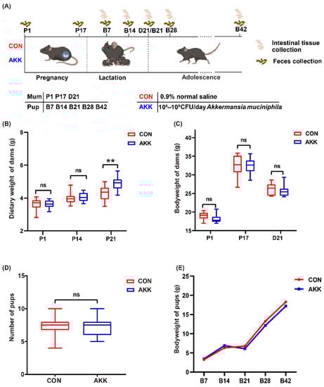 There was no significant reduction in dietary weight and body weight between A. muciniphila-fed and placebo-fed dams (Figure 1B,C). The amount of food intake was measured weekly during pregnancy, and our analysis showed that the AKK group had significantly increased food intake before birth (P21) than the CON group (4.29 ± 0.44 vs. 4.89 ± 0.49 for the CON group vs. the AKK group, respectively, p = 0.002) (Figure 1B). As the numbers of pups per litter were not always the same, and these pups had started ingesting solid foods in the later lactation period, the amount of maternal food intake during lactation was not recorded. By the time before birth (P17), dams in both groups weighed approximately 32 g. As the lactation period ended, maternal weight decreased (Figure 1C). In addition, A. muciniphila supplementation had no adverse effects on gestational outcomes. All female mice delivered naturally, and the number of offspring was not affected by A. muciniphila supplementation (Figure 1D). Over time, the pups grew normally and gained weight, with no significant difference between the two groups at any time point (Figure 1E).